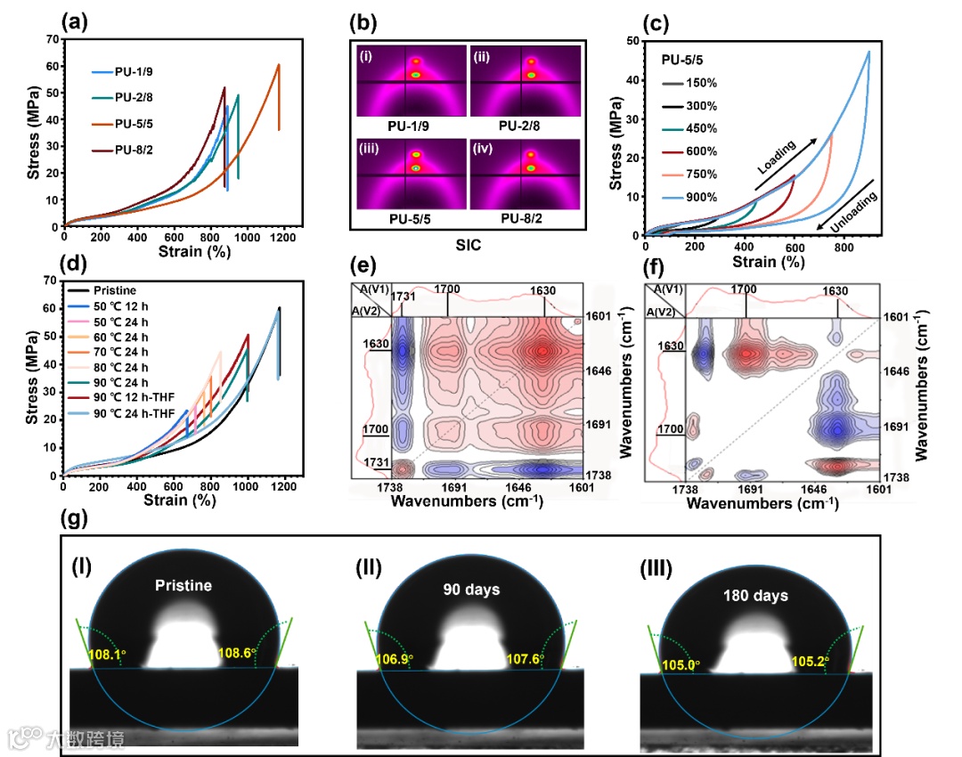 近日,四川大学吴锦荣教授团队在聚氨酯弹性体网络中引入对称/非对称氢键构建大而无序的动态硬相(图1)实现了其机械性能强韧化、损伤自报告/修复过程可视化及信息加密-解密。作者通过变温红外(VT-IR)、密度泛函理论(DFT)计算、小角X射线衍射(SAXS)和正电子湮没寿命谱(PALS)证明了聚氨酯弹性体网络中大而无序的动态硬相的形成(图2)。应力松弛谱、双量子固体核磁(DQ-NMR)和分子动力学模拟揭示了弹性体网络的弛豫动力学行为(图2)。研究发现,这种大而无序的硬相使弹性体网络具有双重优势。一方面,网络中大硬相相区的分布使其具有小的自由体积分数、优异的应变诱导结晶和高效的能量耗散能力,从而赋予弹性体高的机械性能(拉伸强度:60.7 MPa)和快的应变自恢复能力(700%应变循环加载6次后网络弛豫4 h即可恢复初始水平);另一方面,网络中无序硬相的松散堆砌对网络链的限制程度小,赋予了网络较高的弛豫动力学,从而实现聚氨酯弹性体高的修复效率(97.8%)。聚二甲基硅氧烷作为软段之一可赋予该弹性体优异的疏水性(图3)。不对称扩链剂苯并咪唑的荧光特性赋予弹性体荧光强度响应性,可自我报告机械/化学损伤和可视化修复过程,同时在信息加密和解密方面具有潜在的应用前景(图4)。