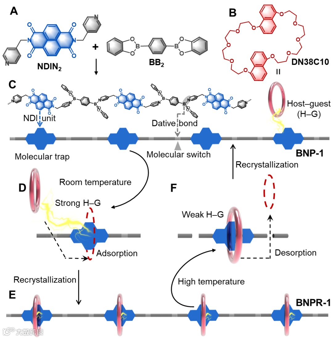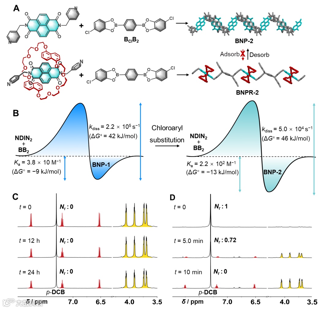 在本工作中,作者提出了一种自适应吸附(Adaptisorption)的新策略,由热力学和动力学控制单元协同实施。作为概念性的验证,作者展示了冠醚大环的自适应吸附(图1): 缺电子的NDI单元作为热力学单元可以有效的捕获富电子的冠醚大环,快速交换的B-N配位键作为动力学的分子开关,让冠醚大环在B-N键打开的瞬间进入并被吸附在聚合物(BNP-1)轴上。在室温下,冠醚大环能在B-N键交换的瞬间进入并被吸附在聚合物轴上,形成了热力学更稳定的聚轮烷(BNPR-1)。另一方面,加热到60 oC会显著减弱主客体作用力,使结合常数降低一个数量级。因此,将大环吸附的能量阱变得更浅,且不足以抵挡自身自发的熵增趋势。最终大环从高浓度的聚轮烷中被施放到了低浓度的溶液中,形成了脱吸附。