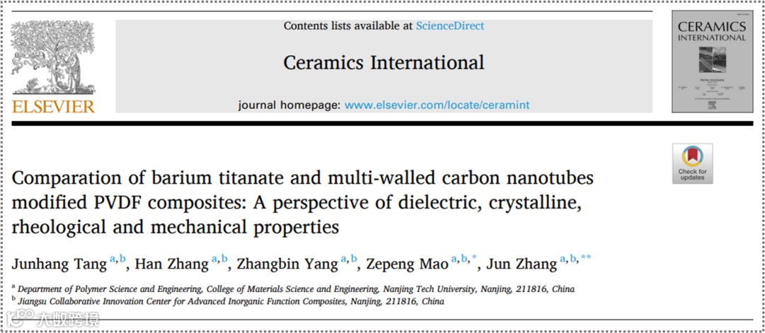 近日,以南京工业大学材料科学与工程学院硕士研究生汤骏航为第一作者、毛泽鹏副教授为通讯作者在国际期刊Ceramics International发表题为“Comparation of barium titanate and multi-walled carbon nanotubes modified PVDF composites: A perspective of dielectric, crystalline, rheological and mechanical properties”的研究工作。该工作选用高介电陶瓷钛酸钡(BaTiO3,BT)和导电填料多壁碳纳米管(MWCNT)修饰铁电聚合物聚偏氟乙烯(PVDF),通过简单熔融共混的工艺制备了PVDF/BT和PVDF/MWCNT两种复合材料,对比了它们的介电、结晶、流变和机械性能。