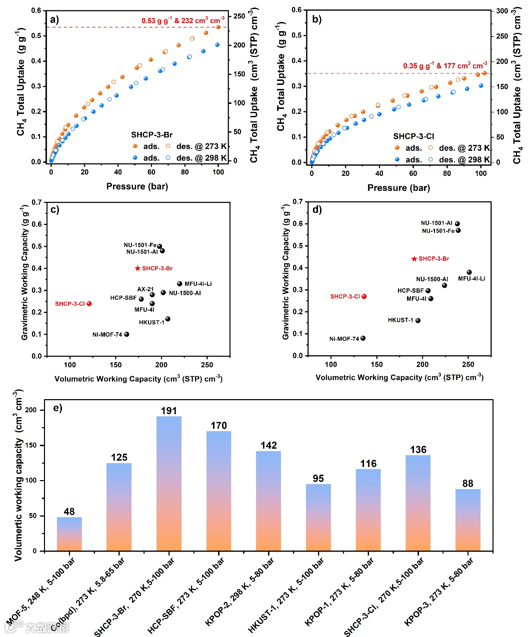 高压甲烷吸附测试显示,SHCP-3-Br在273 K和298 K下的质量和体积容量显著优于SHCP-3-Cl,这主要得益于SHCP-3-Br更高的比表面积和更大的孔体积。在273 K/100 bar的条件下,SHCP-3-Br展现出的甲烷总吸附量为0.53 g/g(232 cm³ (STP)/cm³),质量容量超过了美国能源部(DOE)的存储目标(0.5 g/g),这标志着其在商业化ANG技术应用中的潜力。综合来看,SHCP-3-Br凭借其超高孔隙率和卓越的成本效益,有望成为大规模车用甲烷存储技术中的低成本高容量ANG吸附剂候选材料。