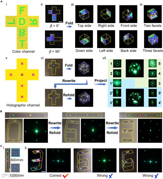 图5:3D多向显示和高级加密器件。(A)多面结构色图像和多方向全息图像在单个立方体形状中的集成。(B)通过可重写的2D光栅结构和可重构的结构的编程组合来记录和形成不同的集成衍射图案。(C)基于可编程3D架构的信息加密。