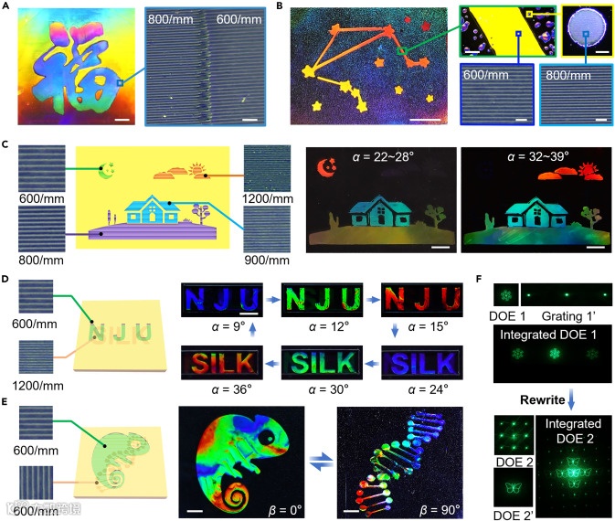 图3:通过整合不同的光学元件,设计复杂的动态显示系统。(A)基于局部重写得到的“福”字图案。(B)基于像素化压印得到的“天秤座星空”图案。(C)不同观测角度下的多色风景图案。(D、E)基于双面压印的动态结构色系统。(F)基于双面纳米压印的集成衍射图样。