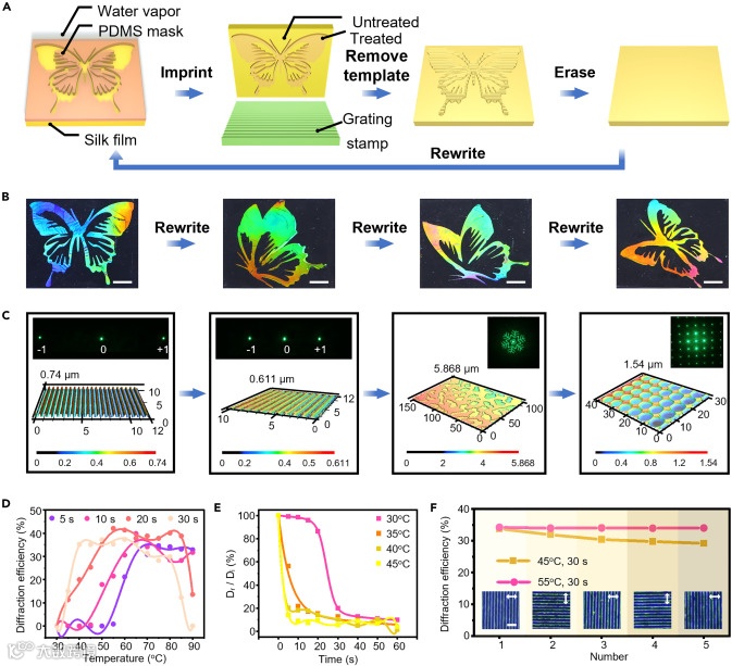 图2:基于水蒸气辅助微/纳米压印技术的光学结构的重写。(A)图案化光学结构的制备和重写示意图。(B)四种不同姿势的蝴蝶图案的连续书写。(C)不同衍射光学元件之间的可控重写。(D)丝膜衍射效率与水蒸气处理条件的关系。(E)残余衍射效率(Dr)与初始衍射效率(Di)之比与水蒸气中擦除时间的关系。(F)连续多次压印过程中丝膜衍射效率的变化。