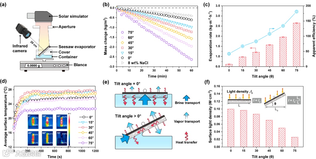 跷跷板构型能够有效优化蒸发器的热管理及蒸发过程,提升其蒸发效率(图3):1)能延长传质与传热路径,减少向本体溶液的热传导损失; 2)表面光功率密度的改变能调节相应的蒸发温度,不仅能减少向环境的热辐射与热对流损失,也能使部分区域温度低于环境温度,强化了环境蒸发效应; 3)引入额外的蒸发面积,有利于水的表面化以及蒸气的逸散。基于上述优势,该跷跷板蒸发器针对8 .0 wt%的盐水时的表观蒸发速率达2.65 kg·m-2·h-1,表观蒸发效率为181.0%。