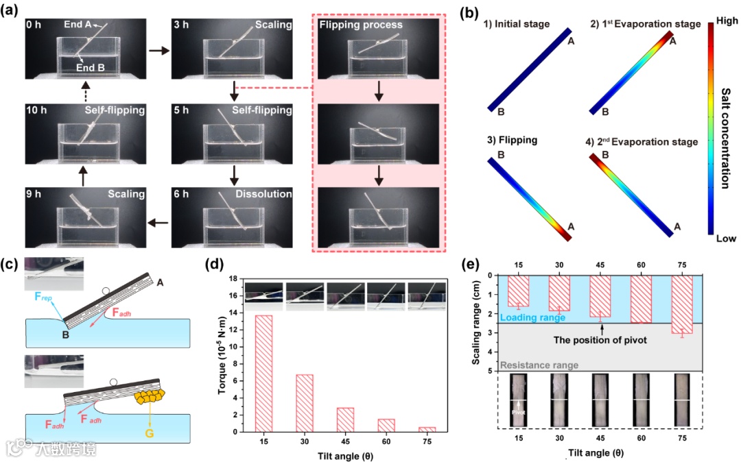 在跷跷板构型下,蒸发驱动的定向传递能将盐离子由本体溶液传输至悬空一端,且使其富集而析出盐垢(图4)。当盐垢积累至一定量时,所施加的力矩会打破跷跷板的力平衡,引发自翻转,析出的盐被水溶液溶解,实现除垢。定向传递的方向会随翻转而改变,进而在另一端析出盐垢,为周期性的自翻转除垢创造了条件。