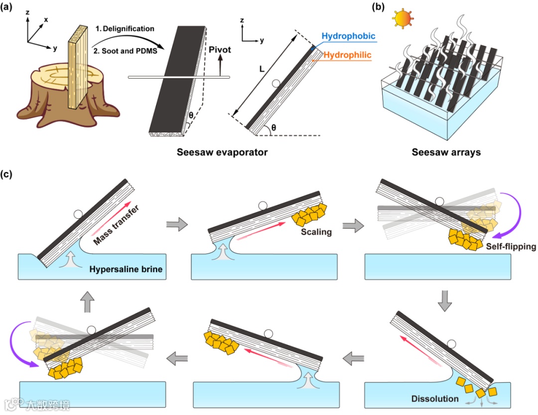 图1. 两面神跷跷板光热蒸发器的设计思路及其自除垢机制示意图。
