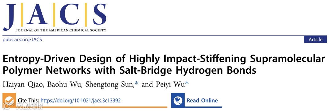 以上研究成果近期以“Entropy-Driven Design of Highly Impact-Stiffening Supramolecular Polymer Networks with Salt-Bridge Hydrogen Bonds”为题,发表在《Journal of the American Chemical Society》上(DOI: 10.1021/jacs.3c13392)。东华大学化学与化工学院博士研究生乔海燕为文章第一作者,孙胜童研究员和武培怡教授为论文共同通讯作者。
