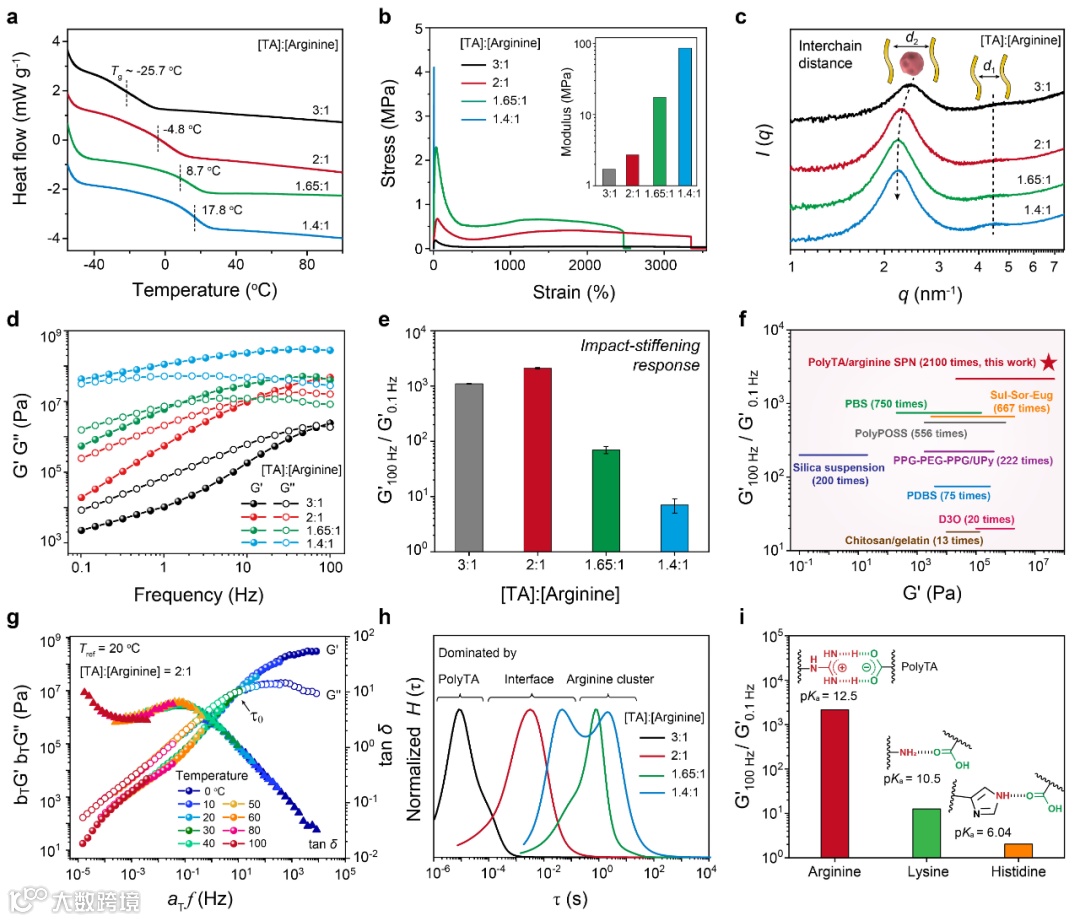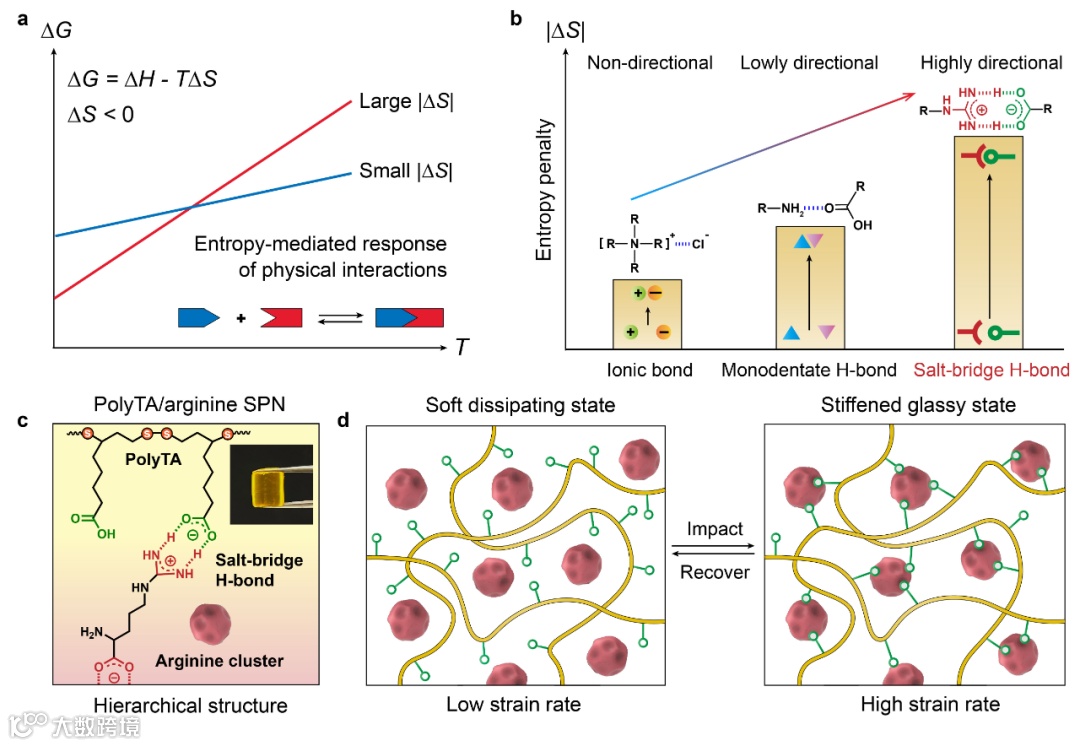 与无方向性(如离子键)或弱方向性(如单齿氢键)的物理相互作用相比,盐桥氢键方向性极高,具有较大的熵罚。基于此,该团队设计了聚硫辛酸和精氨酸复合体系以构筑高熵罚的胍基-羧酸盐桥氢键。由于精氨酸羧基的pKa(~1.8)远小于聚硫辛酸(~4.7),精氨酸倾向于以分子簇的形式分散在聚硫辛酸基体相中。这一微相分离结构大大强化了界面盐桥氢键对材料动力学的控制能力。当受到冲击时,优化比例的超分子聚合物材料从柔软耗散态(G′~ 21 kPa,0.1 Hz)迅速切换至硬化玻璃态(G′~ 45.3 MPa,100 Hz),储能模量提升了约2100倍,超过了绝大多数冲击硬化材料。