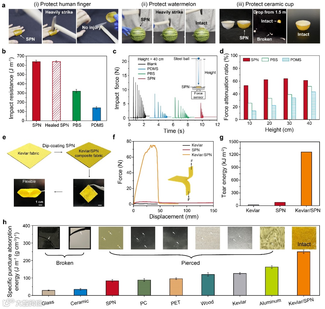 图5.冲击硬化超分子聚合物及其复合织物的抗冲击性能