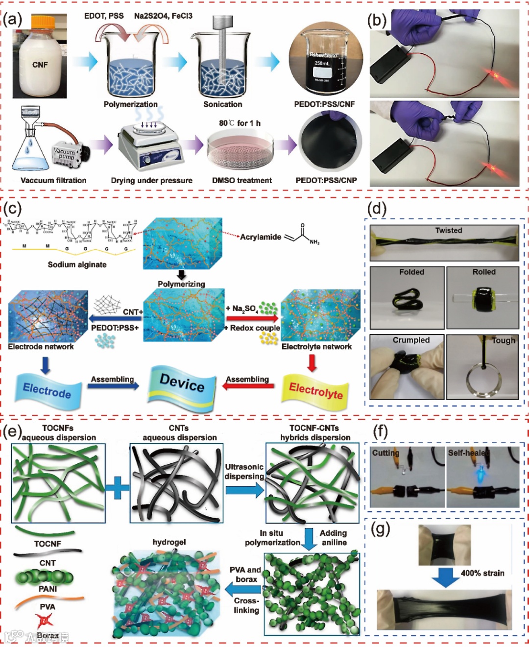 生物质材料在超级电容器电解质中也有很大的应用前景,如图7所示。在生物聚合物中加入亲水官能团,如-OH、-COOH、-NH2和CONH2,可使其对极性溶剂具有极佳的润湿能力。此外,这些官能团与盐阴离子发生相互作用,可以提高电解质在含盐环境中的溶解度,并增强阳离子传输特性。可通过接枝、加入无机填料和混合等方法对生物聚合物水凝胶进行改性。通过混合或共埋聚合加入聚合物单体可进一步提高生物聚合物水凝胶的离子传导性,这种方法可有效降低生物聚合物的结晶度,从而增强离子传导性。