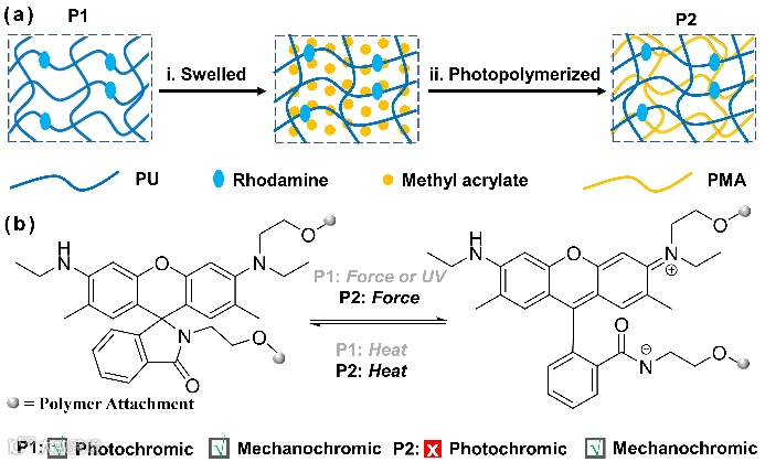 本研究中使用的罗丹明衍生物(Rh-2OH)是一种典型的、应用广泛的力敏色团。首先,将Rh-2OH (2.50 wt%)共价接入聚氨酯(P1)中。然后在丙烯酸甲酯单体中溶胀P1,通过光聚合法制备PMA2.8/PU IPN (P2)。P1表现出光-力响应,P2则表现出对力的选择性响应(图2)。