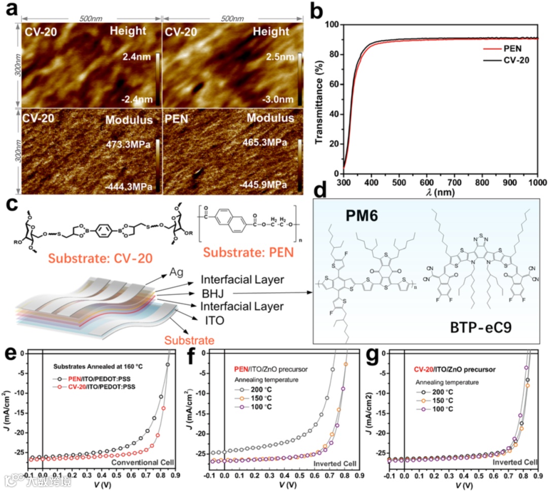 随着物联网(IoT)技术的飞速发展,人们对低毒、稳定的能源供应设备的需求与日俱增。有机太阳能电池(OSC)在柔性设备应用方面具有巨大的潜力;然而,现有的柔性衬底(如 PET、PEN 和 PI)都有其局限性。PET 和 PEN 的玻璃转化温度 (Tg) 限制了器件制造过程中的高温退火工艺,而 PI 在可见光区域的低透射率则阻碍了太阳光的收集。