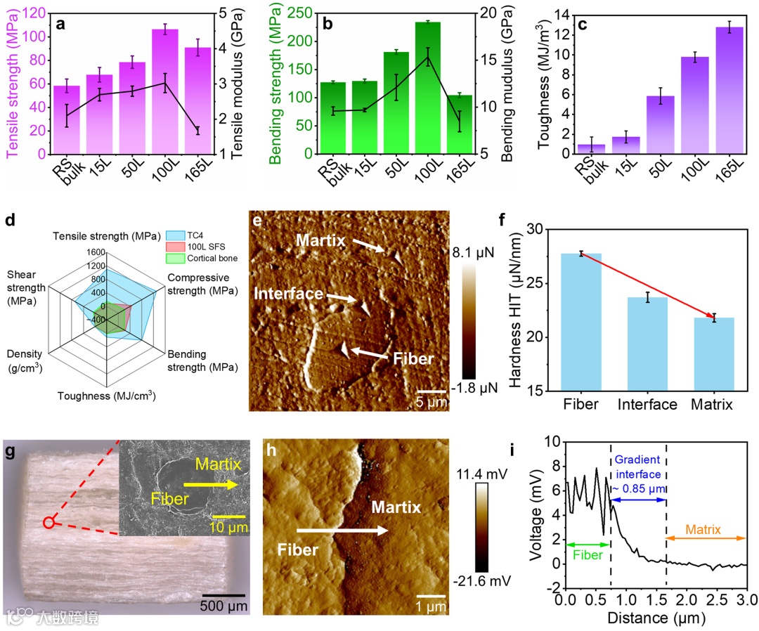 如图3所示,SFS的拉伸强度最高为106.5 MPa,弯曲强度最高为234.4 MPa(图3a-b)。SFS的韧性范围为1.0-12.8 MJ/m3(图3c)。SFS的力学性能与TC4钛合金相比更接近人体皮质骨,满足骨折部位固定的需求,且不会产生应力屏蔽作用(图3d)。SFS截面的纳米压痕(图3e-f)和AFM(图3g-i)测试表明复合材料的刚度从纤维到基体逐渐下降,而不是在界面处急剧下降。梯度界面层有助于将应力从基体传递到纤维增强体,进一步提高复合材料的机械性能,这也是SFS具有优异机械性能的原因所在。