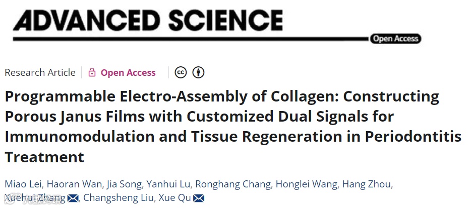 近期,华东理工刘昌胜院士/屈雪教授联合北大口腔张学慧教授团队报道了一种盐效应调控的胶原蛋白电组装技术,能够便捷、高效构建出具有精确可调的多孔结构(即孔隙率和孔径)的胶原薄膜。特别是,诸如抗炎药物双氯芬酸钠(DS)之类的生物活性盐类也可以调节多孔结构,并同时实现药物的负载及缓释。在预编程条件下进行顺序电组装,能够制造出载DS的致密-多孔Janus复合膜。含有DS的多孔层通过其多孔形态和释放的DS提供双重理化信号,协同抑制炎症并促进成骨。致密层引导纤维组织定向生长,防止其侵入骨缺损区域中。总体而言,这项研究证明了利用电化学沉积技术进行胶原蛋白可编程组装的巨大潜力,可实现功能定制以适应再生医学的特定需求。具体成果以 “Programmable Electro-Assembly of Collagen: Constructing Porous Janus Films with Customized Dual Signals for Immunomodulation and Tissue Regeneration in Periodontitis Treatment”发表在《Advanced Science》上。