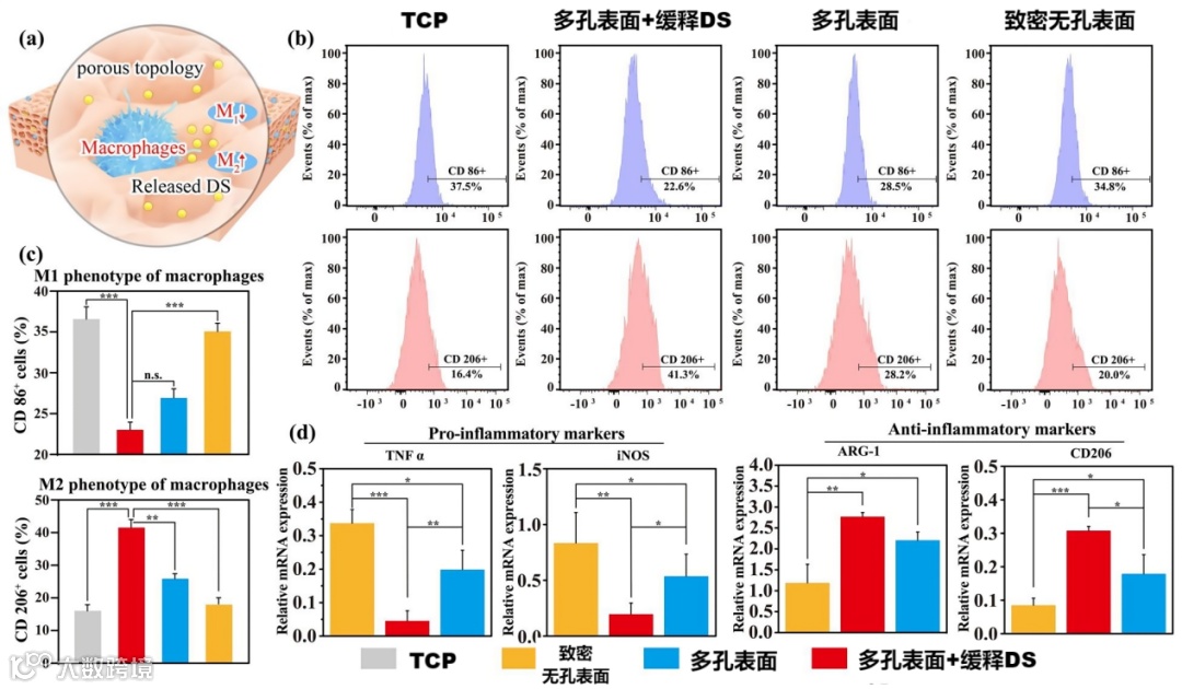 图3. 不同薄膜的体外抗炎功能。(a) 在 E-Janus Col/DS的多孔表面(可缓释DS)上培养被LPS激活的巨噬细胞(即RAW264.7)的图示。(b) TCP(即空白组)、E-Janus Col/DS的多孔表面、E-Col/Cl-的多孔表面、E-Col的致密无孔表面上孵育的巨噬细胞的 CD 86 +(M1标记)和 CD206 +(M2 标记)流式结果。(c)不同组中RAW 264.7的M1和M2极化的定量百分比(n= 4)。(d) 在薄膜表面培养24小时后,RAW264.7的促炎和抗炎相关基因表达。这表明E-Janus Col/DS薄膜的多孔表面结构协同缓释的DS对炎症降低的效果最为明显(n= 4)。* p < 0.05,** p < 0.01,*** p <0.001。所有数据均以平均值±标准差表示。使用单因素方差分析进行比较。