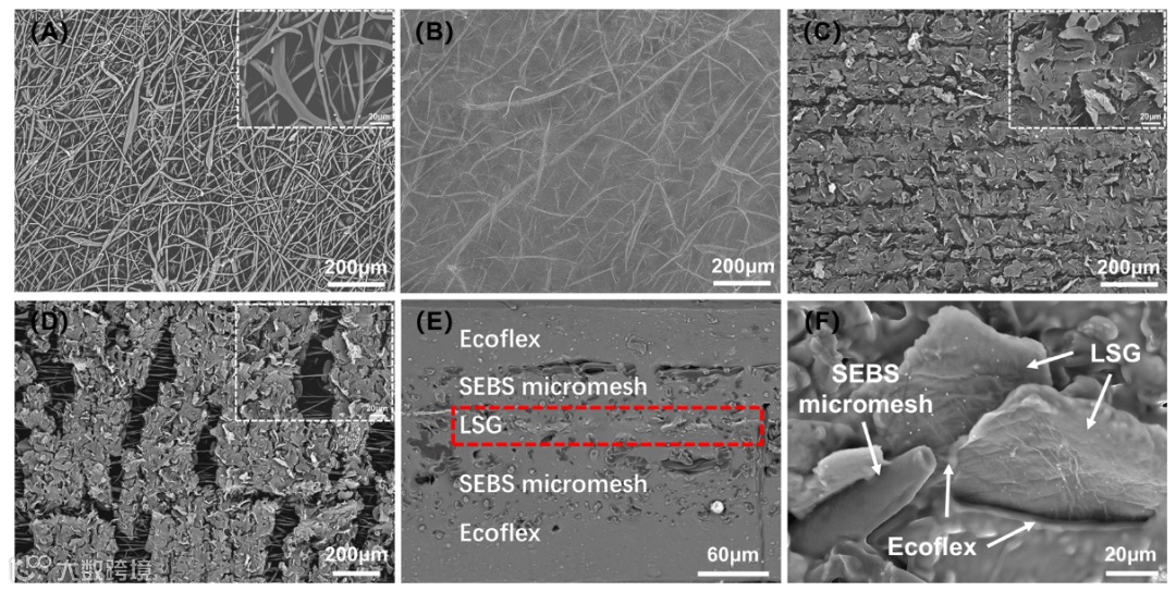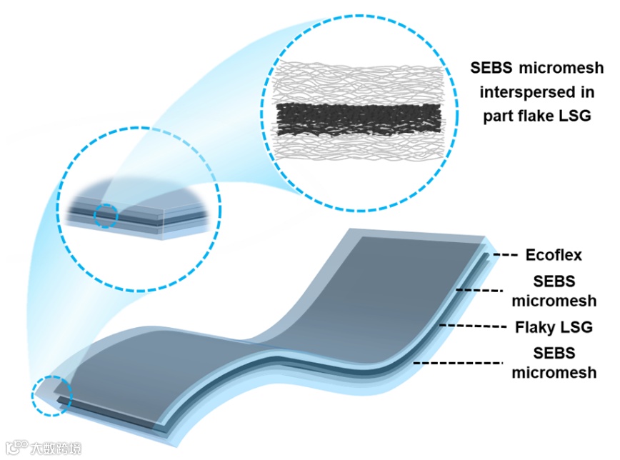 MRSS由包裹在Ecoflex中的两层SEBS微米织物和一层片状LSG组成。激光直写过程中,激光产生的焦耳热导致局部高温,使得涂敷在微米织物上的氧化石墨烯被还原为石墨烯,同时氧元素气化所释放气体导致石墨烯片层膨胀并部分包裹微米织物。使用Ecoflex浸润后,Ecoflex渗透并包裹住微米织物和石墨烯,并与微米织物形成复合柔性基底。