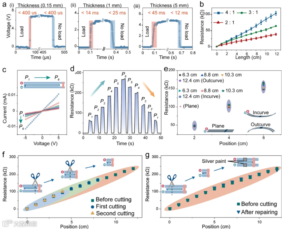 图2. IP织物传感器性能和电输出特性的系统研究。(a) IP 织物传感器的响应时间和恢复时间。(b) 不同去离子水与碳纳米管溶液重量比下导电织物条的电阻与长度的关系。(c) 在 IP 织物传感器的不同位置测量的 I–V 曲线。(d) IP织物传感器不同位置的电响应。(e) IP 织物传感器处于不同状态时响应电阻与位置的关系。(f) IP 织物传感器的可切割性。(g) IP 织物传感器的可修复性。