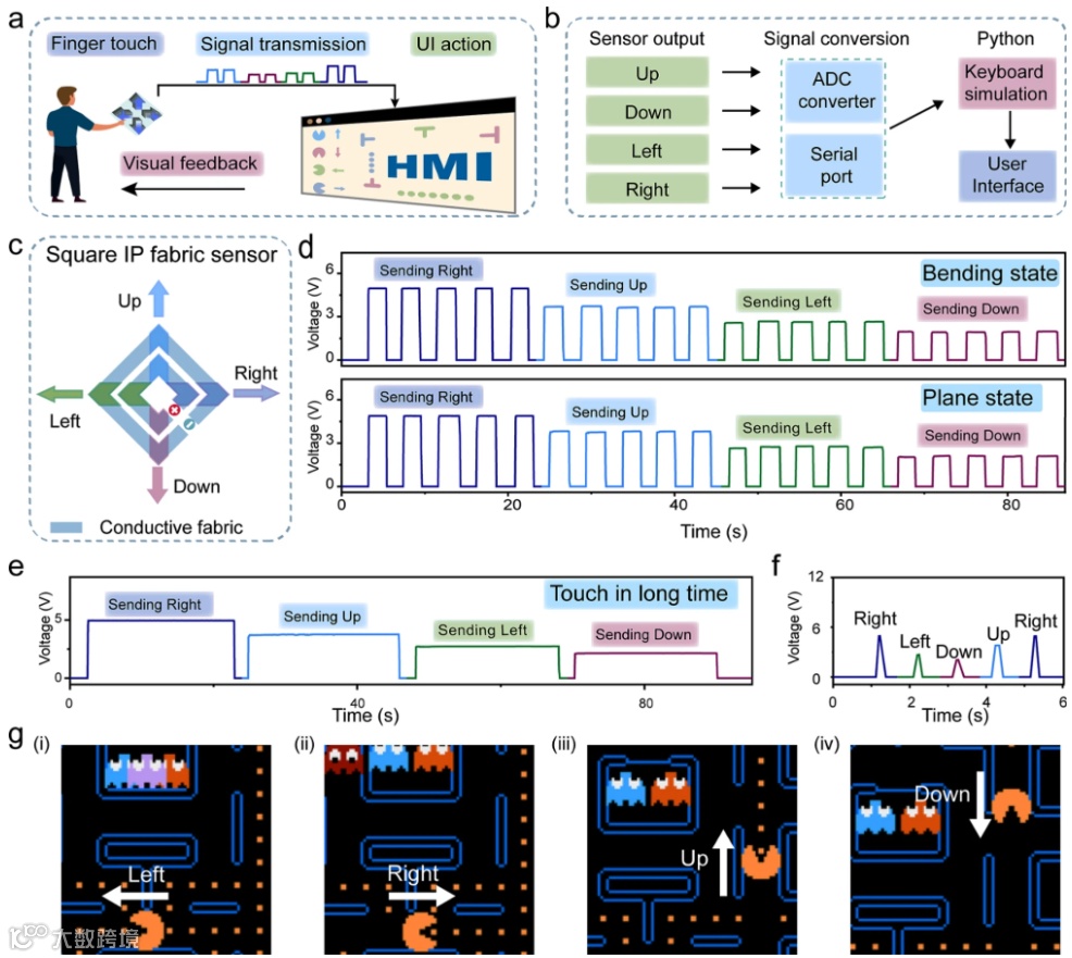 图3. 基于方形IP织物传感器的闭环互动娱乐系统。(a) 闭环互动娱乐系统直接控制示意图。(b) 闭环互动娱乐系统的工作流程。(c) 方向控制器示意图。(d) 方形IP织物传感器中每个角在不同状态下的电压响应。(e) 方形IP织物传感器的长期连续触碰电压信号。(f) 快速触碰IP织物传感器时发出的指令。(g) 交互界面在执行不同指令时的操作。