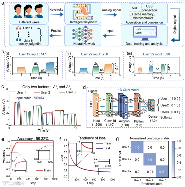 图5. 基于S形IP织物传感器的用户识别和验证系统。(a) 用户识别和验证系统流程示意图。(b)S形IP织物传感器以不同数字序列输入的不同用户的响应电压。(c) 当不同用户输入相同的数字序列时,S 形 IP 织物传感器的响应电压。(d) 1D CNN的最终结构,经过优化,用于识别三个用户。(e) 一维 CNN 模型的精度(无量纲)。(f) 训练过程中 1D CNN 模型的损失(无量纲)。(g) 测试集的混淆矩阵。