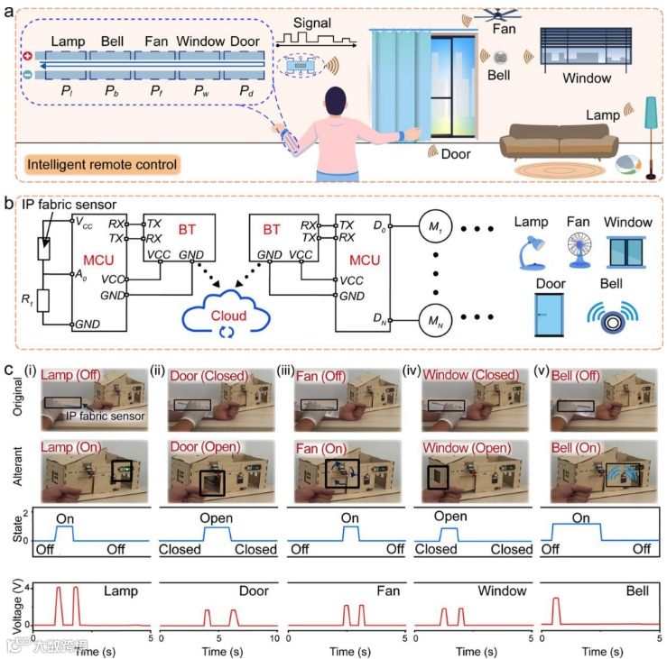 图4. 基于条形 IP 织物传感器的智能家居系统。(a)智能家居系统的示意图。(b) 智能家居系统的电路图。(c) 显示 (i) 灯、(ii) 门、(iii) 风扇、(iv) 窗户和 (v) 铃铛的控制。铃铛开机后继续工作一段时间,然后自动关闭。