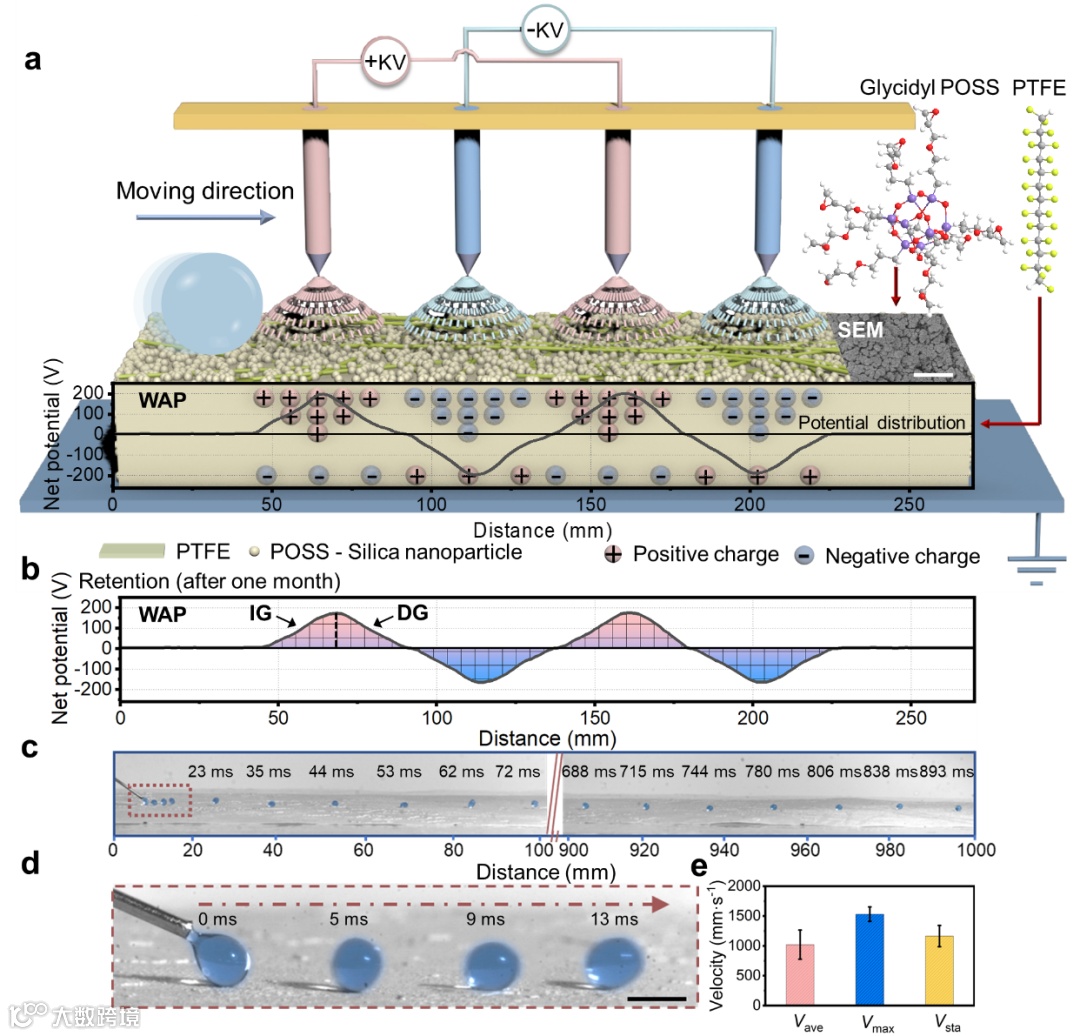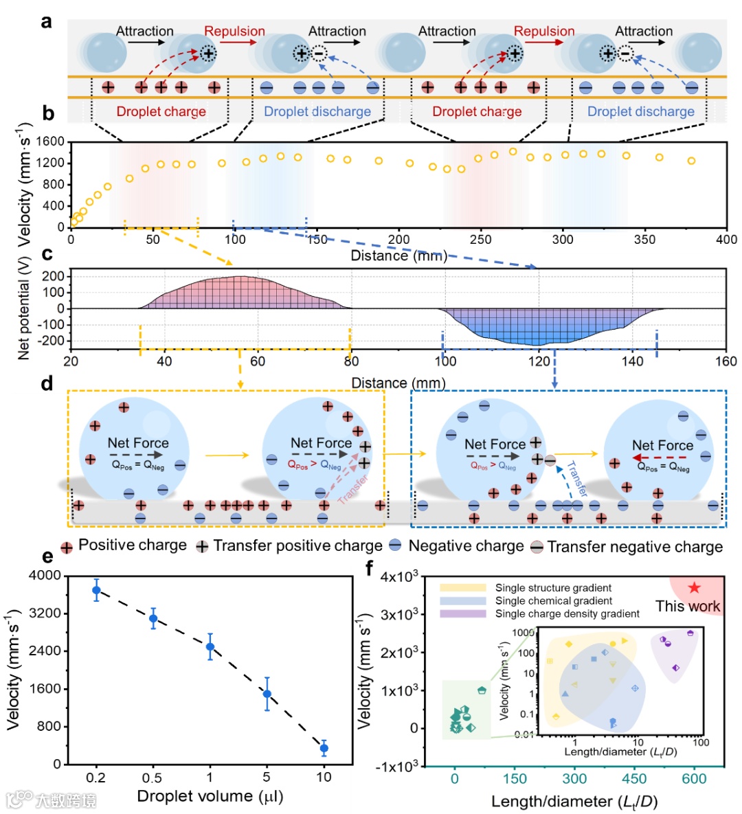 与装配有复杂控制系统的主动操纵不同,快速、持久的液体自驱动在热量传递、病理自检等领域具有不可替代的作用。因此,为了打破界面对液滴的接触线钉扎,研究人员在固体表面预先设计了各类异质性结构,或不对称的化学、电荷密度梯度,使液滴自发朝表面能更高的区域进行移动。然而,作为一把双刃剑,表面液滴尽管可以在梯度化界面上实现初步运动,但不对称的梯度密度始终有其相应的极限,使液滴仅能在短距离内进行传输。同时,为了保证液滴的传输速度与效率,更高的密度梯度进一步压缩了液滴的运输空间。因此,如何在保证传输效率的同时,大幅提高液体的自输运距离成为了一个亟待解决的难题。