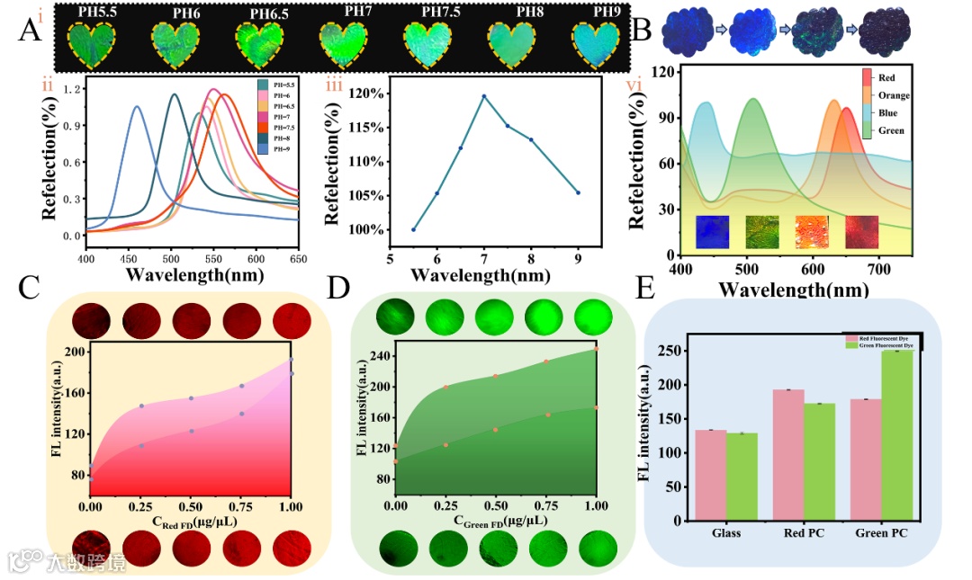 图3. MMMs 贴片对荧光的选择性增强示意图。(A) (i) 中图像的数码照片。(ii)中PC爱心的图案对不同 pH 值溶液的相应反射光谱。(iii) PC爱心的图案在 550 nm波长处的反射率随溶液的 pH 值变化。(iv) 中不同颜色 PC 薄膜的反射率。(B) 蓝色 PC 薄膜失水后变为透明的过程示意图。(C) 红色和绿色 PC 薄膜在 0、0.25、0.5、0.75 和 1.0 μg/L 罗丹明红荧光染料下的荧光强度示意图。(D) 红色和绿色 PC 薄膜在 0、0.25、0.5、0.75 和 1.0 μg/L 绿色荧光染料作用下的荧光强度示意图。(E) 1 μg/L 红色或绿色荧光染料分别在透明玻璃、红色或绿色 PC 薄膜上的荧光强度示意图。