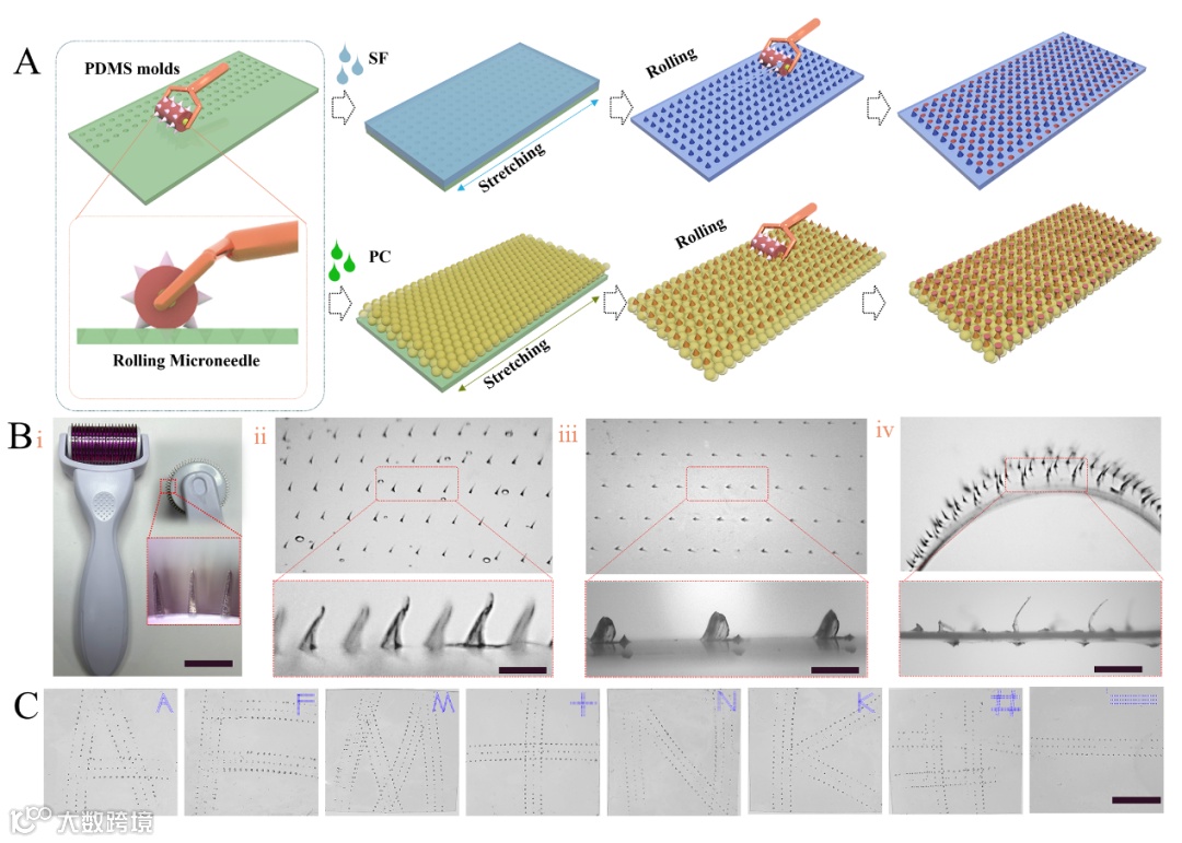 图2. MMMs 贴片的制作过程和表征。(A) 在 PDMS 模具上滚动 RMNs 后剩余孔的示意图。拉伸模具后,分别填充丝纤维蛋白溶液和EPC单分散纳米粒子。干燥后,用 RMNs穿孔,最后得到不同材料的带孔 的MNs贴片。(B) (i) RMNs 的头部和针细节的正面和侧面示意图(比例尺:25 mm)。(ii) 示意图仅显示 MNs 和特定局部细节。(iii) 示意图仅显示单侧孔及其局部细节。(iv)同时显示 MN 形态和孔及其局部细节的示意图(从 ii 到 iv;比例尺:500 μm)。(C) 使用 RMN 进行轧制的图案示意图分别为 "A"、"F"、"M"、"十"、"N"、"K"、"#"和 "一"(比例尺:15 毫米)。