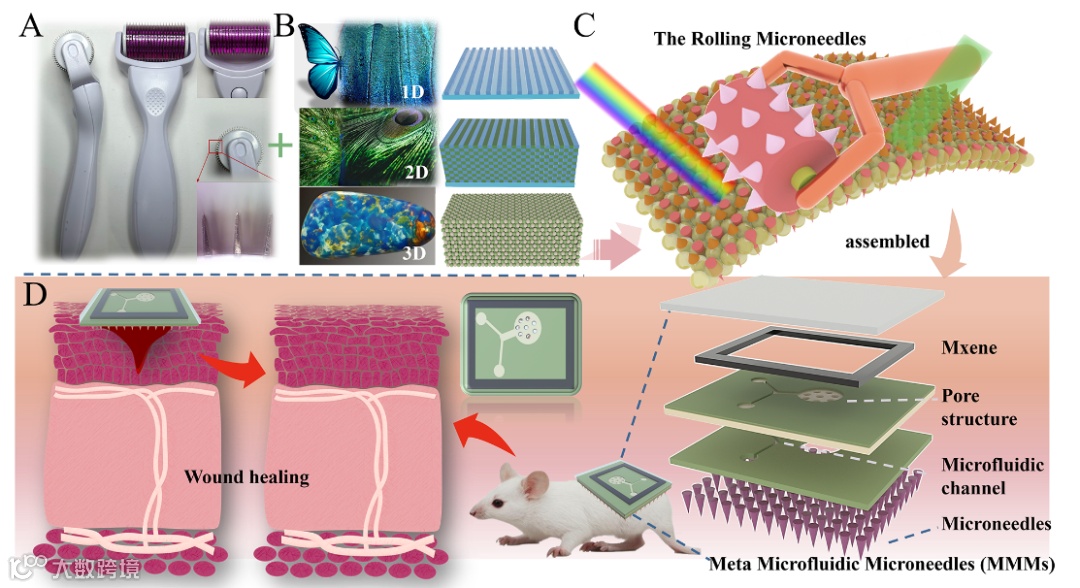 图1. 超结构微流体微针(MMMs)用于智能伤口管理(包括运动传感、生化分析和伤口愈合)的示意图。A.实验中使用的商品化滚动微针正面,侧面和细节图。B.受生物启发的1D,2D和3DPCs。C滚动微针制备基于PC膜的微流体微针示意图。D在伤口愈合的应用示意图及多层结构示意图。