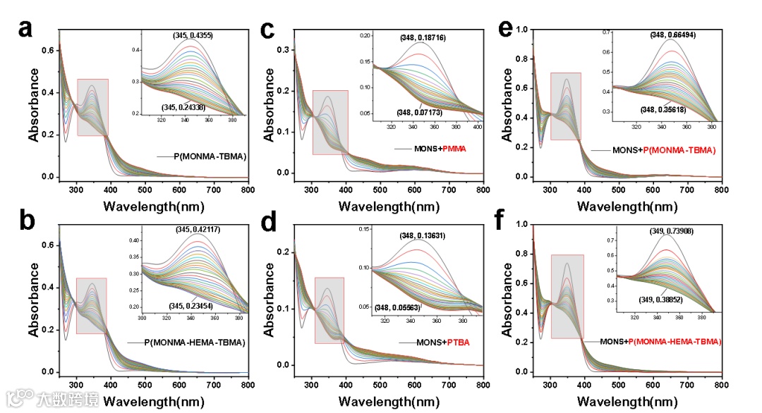 图2. 几种不同光刻胶体系在紫外光辐照下膜层的紫外吸收光谱动态变化:(a) P(MONMA-TBMA); (b) P(MONMA-HEMA-TBMA); (c) MONS/PMMA; (d) MONS/PTBMA; (e) MONS/P(MONMA-TBMA); (f) MONS/P(MONMA-HEMA-TBMA)。