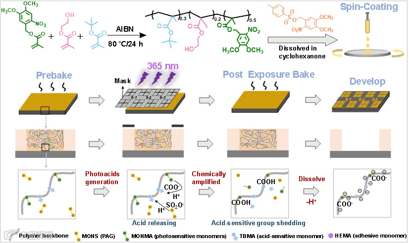 图1. 双非离子型光酸协同增强响应化学放大光刻胶的合成及其光刻工艺示意图。