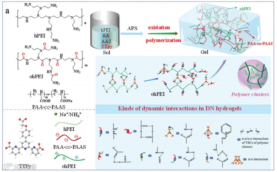 图1. PAA-co-PAAS@ohPEI@TTpy水凝胶的设计原理、制备过程及超分子间作用说明。