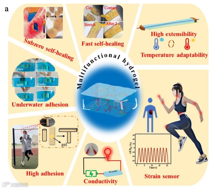 近年来,柔性可穿戴水凝胶应变传感器在医疗保健、人机交互、柔性器件、智能可穿戴设备等领域受到了广泛关注。自愈性、可拉伸性、粘附性、均匀性和透明度是水凝胶应变传感器的重要指标,对推动导电水凝胶在柔性电子皮肤等高科技领域的实际应用具有现实意义。然而,目前文献报道的人工合成水凝胶很难实现这些功能的兼容。