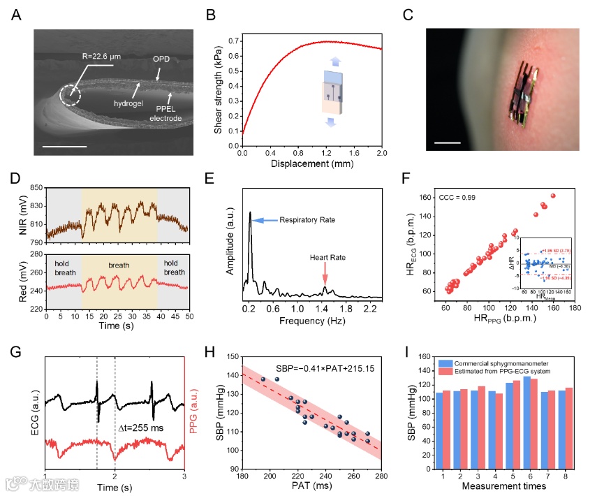 以光电容积脉搏波描记法(PPG)为代表的脉搏与血氧监测技术已普及,因近红外光具有出色的皮肤穿透能力,可通过光电探测器提取皮下血流搏动与血红蛋白含氧量信息,但设计适用于近红外波段的有机光电材料及其柔性传感器件仍具挑战。将基于光电容积变化的PPG信号与基于生物电的心电图(ECG)信号结合,可以增加脉搏信息提取的准确性和可靠性,通过后处理还可获得血压等健康指标。尽管已有柔性ECG电极和PPG传感器相关工作,但构建可靠的可皮肤集成PPG-ECG一体化系统面临巨大挑战,包括传感器间的稳固耦合、各器件的高性能和长期稳定性、与皮肤集成的舒适性等。
