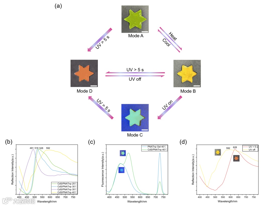 图3. (a) MRCPO多级响应行为实物图 (b) MRCPO温度响应行为反射光谱图 (c) MRCPO与PNATnp水凝胶荧光光谱图对比 (d)MRCPO光致变色反射光谱图。