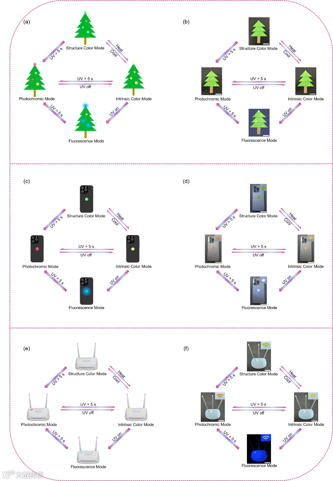 图4. 多级响应型图案化防伪标签 (a, b) 多级响应型圣诞树装饰 (c, d) 多级响应型智能手机标签 (e, f)多级响应型WIFI标签。