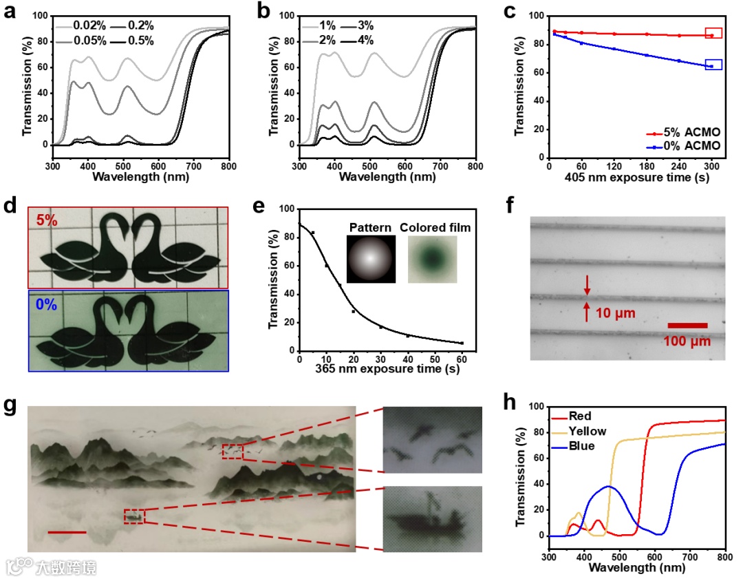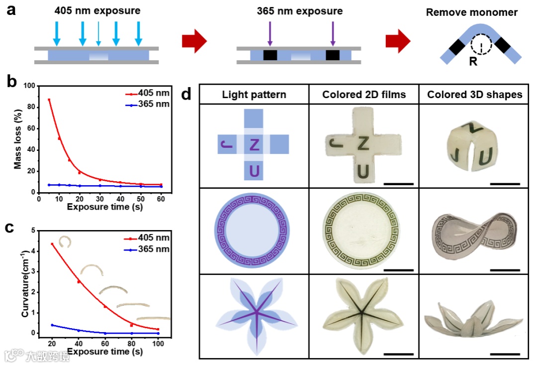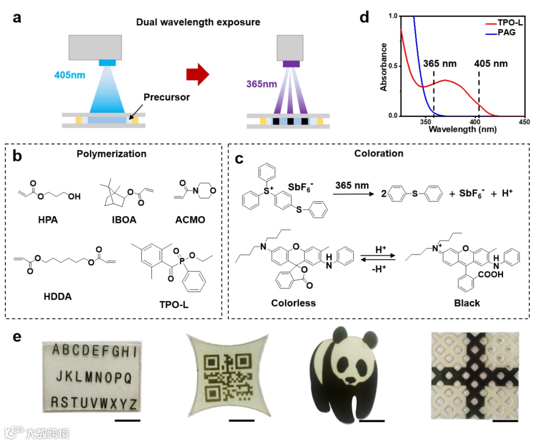 数字光处理(DLP)打印是一种逐面打印的成型方法,在速度、成本等方面具有显著优势。但是,常规的 DLP 打印设备仅有一个树脂槽,打印件为单一均质。两个可转换的树脂槽可以直接打印彩色部件,但需要配置复杂的树脂槽切换装置以避免不同树脂之间的交叉污染,因此会影响打印效率。之前研究报道了一种颜色会随自由基氧化而变色的特殊染料,并结合灰度曝光实现了带有颜色的3D打印。但是该方法会将材料的聚合过程与着色过程相耦合,很难针对某一过程独立调控。