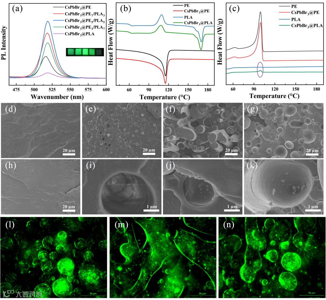 图3 含不同比例PE和PLA CsPbBr3@PE/PLA复合材料的PL光谱、DSC曲线、截面SEM图像和荧光图像