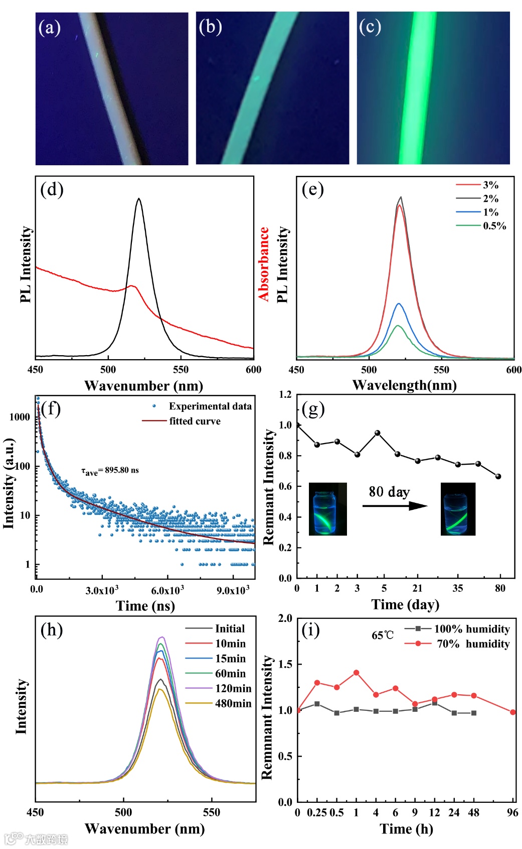 传统的金属卤化物钙钛矿(MHPs)聚合物复合材料通常在有机溶剂中制备,而溶剂的使用往往伴随着环境风险和复杂的后处理步骤。近期,福建师范大学杜克钊团队联合陈庆华/钱庆荣团队在钙钛矿聚合物荧光材料的研究中取得了重要进展。在该工作中,他们采用无溶剂双螺杆挤出技术,通过添加油胺作为CsPbBr3和聚合物之间的相容剂,成功制备了CsPbBr3@聚合物荧光材料,并将其推广到多种商用聚合物(PLA、PP、PE和PBAT)中(图1)。这种方法不仅环保,适用性广,也有效地提高了MHPs的稳定性:CsPbBr3@PE5/PLA5在水中浸泡80天后依旧保持了稳定的绿光发射,同时其蓝光稳定性以及高温高湿条件下的稳定性也得到了显著的增强(图2);并且其优越的加工性能和材料的可定制性为MHPs/聚合物复合材料在3D打印领域的应用提供了可能性。