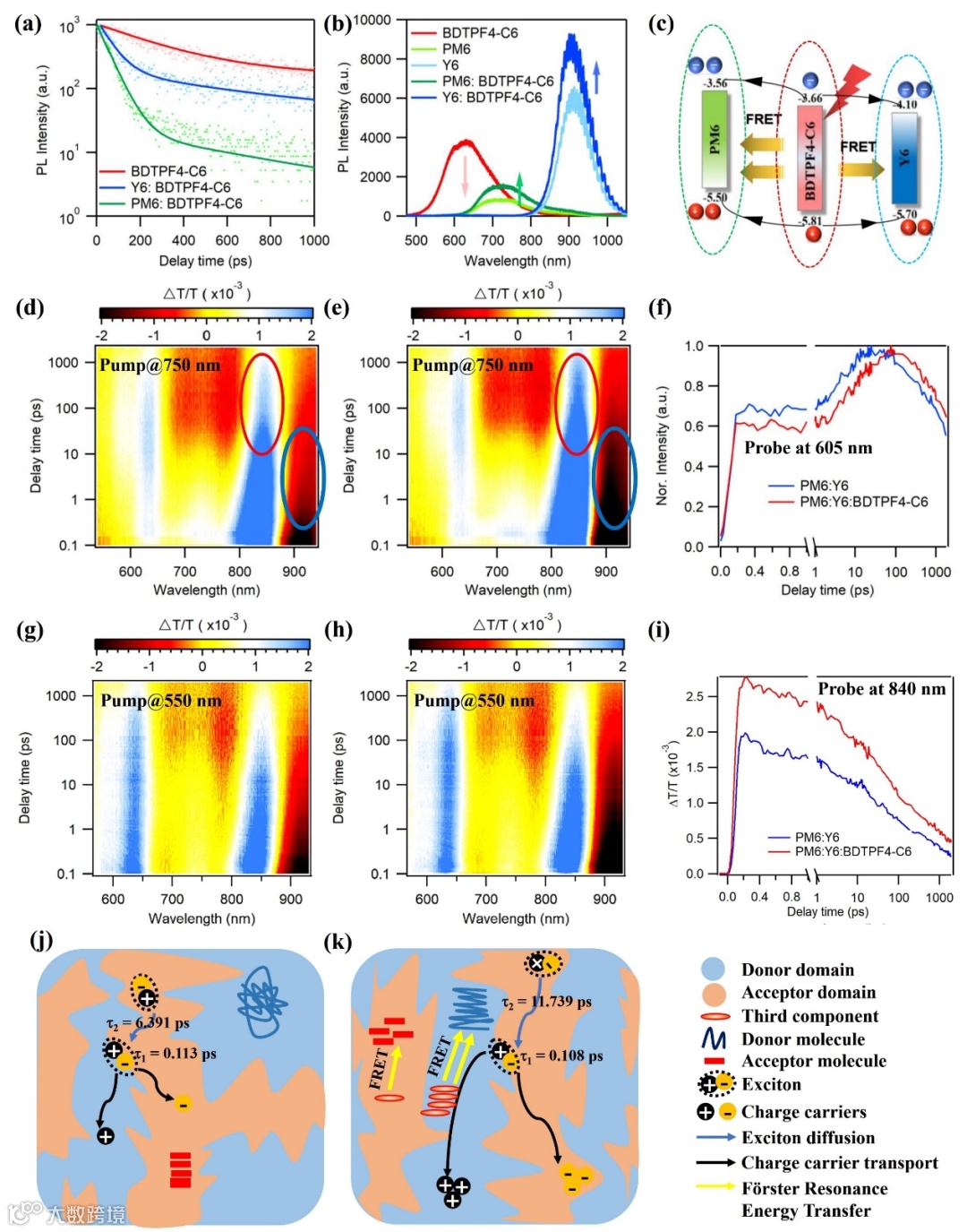 图5. (a) 纯膜和混合膜的TRPL光谱和(b) 405 nm激发下的PL光谱;(c) 混合膜中的FRET过程示意图;(d) 在750 nm激发下,PM6:Y6和(e) PM6:Y6:BDTPF4-C6薄膜的二维飞秒瞬态吸收光谱;(f) 二元和三元薄膜中的空穴转移动力学和复合过程;(g) 在550 nm激发下, PM6:Y6和(h) PM6:Y6:BDTPF4-C6薄膜的二维飞秒瞬态吸收光谱;(i) 二元和三元薄膜中的电子转移动力学和复合过程;(j) PM6:Y6体系中的激子扩散、分离与传输示意图;(k) PM6:Y6:BDTPF4-C6体系中的FRET和激子扩散、分离与传输示意图。