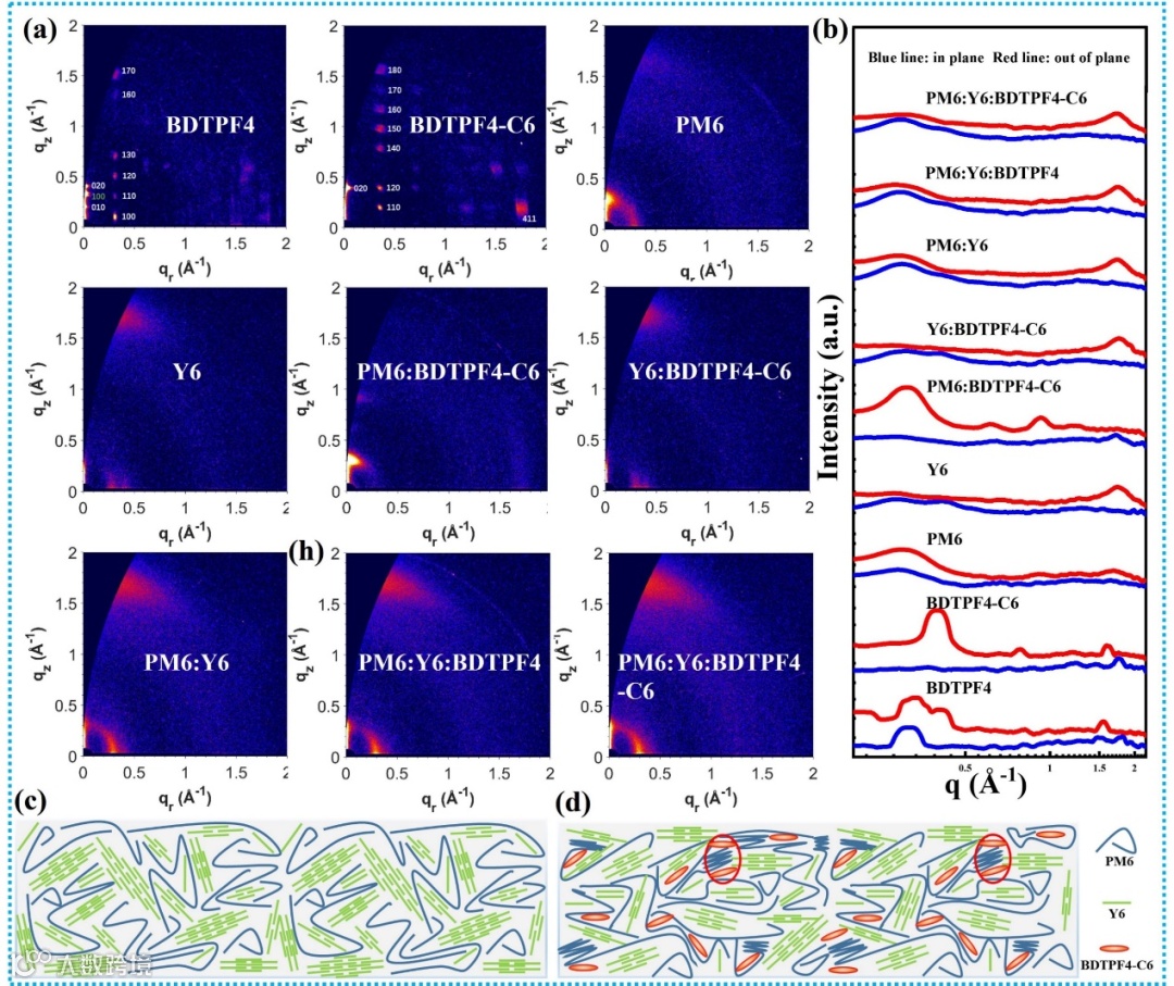 为更深入了解BDTPF4-C6的引入对共混膜结晶性和分子堆积的影响,作者对纯膜和混合膜进行了二维广角掠入射(GIWAXS)测试。如图3所示,BDTPF4和BDTPF4-C6纯膜都显示出许多锐利的布拉格衍射峰,表明其有序的自组装特性。此外,通过标定得出BDTPF4和BDTPF4-C6结晶体分别属于单斜晶系和正交晶系,两种分子在薄膜中都呈现出edge-on取向。BDTPF4-C6在纯膜中表现出更高的晶体对称性和更紧密的堆积,这可能有助于其在三元器件中表现出色。当将液晶小分子BDTPF4-C6分别加入到PM6和Y6薄膜中,通过计算共混膜的结晶相干长度(CCL)得知,BDTPF4-C6可以显著提高PM6结晶性(CCL由49.16 Å提高到130.37 Å)而对Y6提升较小(CCL由21.62 Å提高到23.62 Å),该结果与吸收的结果相一致。因此,可以推断出BDTPF4-C6在活性层形貌演变中的作用,如图3c所示,在引入BDTPF4-C6后,BDTPF4-C6可以作为PM6的成核剂,选择性地提高其结晶度并促进给体和受体之间的相容性,从而形成更均衡的电荷传输和抑制电荷复合。这些特性有助于在三元有机太阳能电池中实现高JSC和FF。