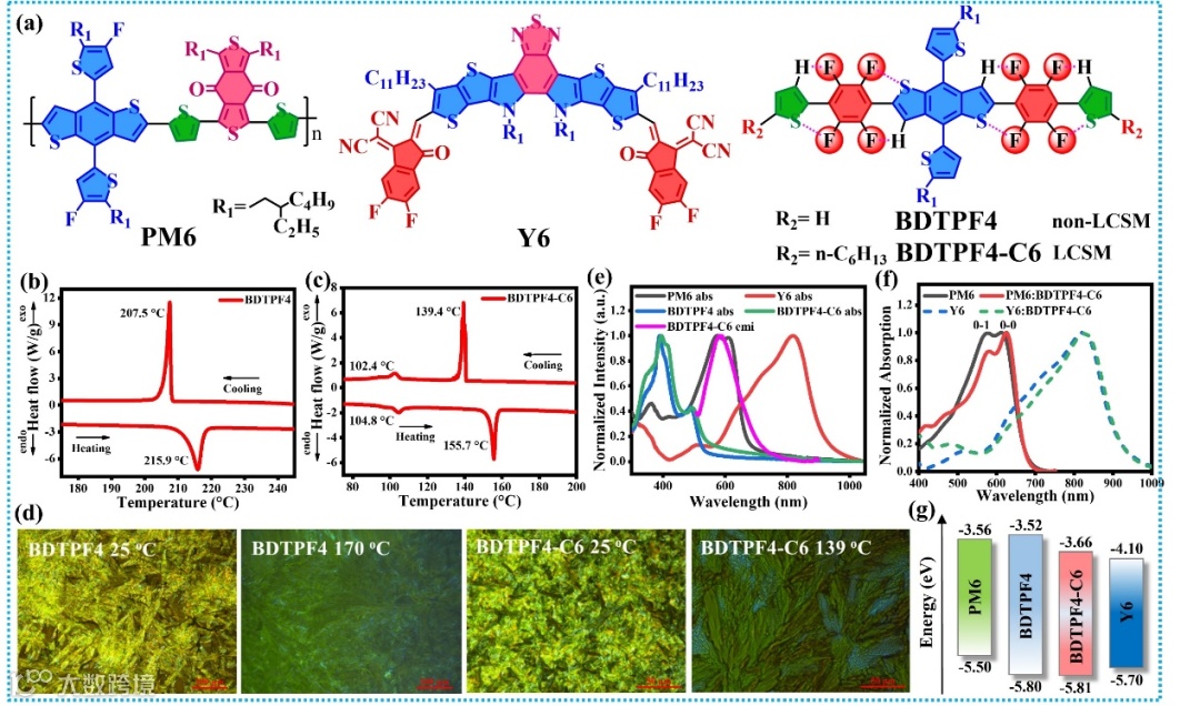 图1. (a)PM6, Y6, BDTPF4和BDTPF4-C6化学结构式;(b) BDTPF4和 (c) BDTPF4-C6 DSC谱图;(d) BDTPF4和BDTPF4-C6在不同温度下的偏光显微镜图; (e) PM6,Y6,BDTPF4和BDTPF4-C6纯膜的归一化UV-vis吸收光谱和BDTPF4-C6纯膜的归一化PL发射光谱图; (f) PM6,PM6:BDTPF4,Y6和Y6:BDTPF4-C6薄膜的归一化吸收光谱;(g) PM6,Y6,BDTPF4和BDTPF4-C6的能级示意图。