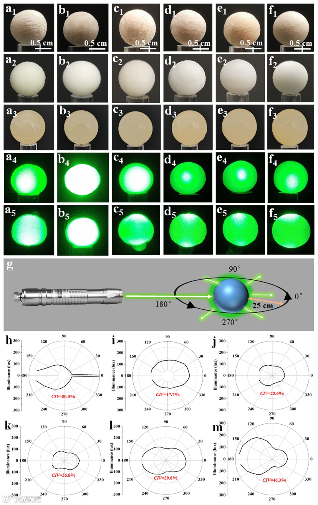 其次,用于空间照明的材料,还需要有良好的照明均匀性。而不同木材,其细胞壁厚度和纤维素体积分数等自身结构特性完全不一样,这将严重影响激光木材照明均匀性。为此,本研究选用6种不同密度的球形木材为原材料,脱除木质素之后,浸入聚乙二醇二丙烯酸酯,光固化后得到不同类型的激光木材。激光木材的光照均匀性采用光照变异系数来表示,研究结果表明:只有合适的原始木材密度才能用于制备具有高效率3D空间均匀照明的激光木材,其最低变异系数为17.7%,此时激光木材周边散射光强度分布接近于球形,且其变异系数远低于商业的光散射体,而且光照均匀性大于 0.9,远高于国际标准化组织对室内工作场所照明的要求,散斑对比度也远低于商业散射体材料。同时,研究小组还探索球形激光木材的直径以及光入射方向对光变异系数的影响。