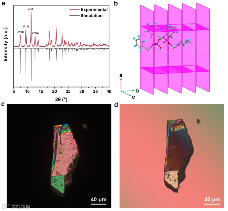 CityU-10在常用实验室溶剂(水,甲醇,二氯甲烷,丙酮等)中能稳定存在,同时具有良好的热稳定性质,分解温度为356°。实验粉末 X 射线衍射 (PXRD)数据与 SCXRD 数据的模拟衍射图非常吻合,表明了CityU-10 的高相纯度(图5)。CityU-10具有明显的双折射现象,相应的双折射率高达0.133@550 nm,比之前报道的聚合物单晶高一个数量级。 如此大的双折射率可能归因于聚合物链和层之间的氢键相互作用以及Te-O-P的主链。通常,聚合物链具有由化学结构的不对称性引起的固有光学各向异性。但是聚合物链倾向于随机取向排列,因此它们的各向异性会相互抵消,从而表现出宏观各向同性且不具备双折射性质。然而,如果一种聚合物中的链是有序且定向良好的,则该聚合物可以表现双折射特性。CityU-10 的螺旋聚合物链通过氢键有序排列,引起了明显的双折射现象,从而使其在光学领域具有广阔的应用前景。