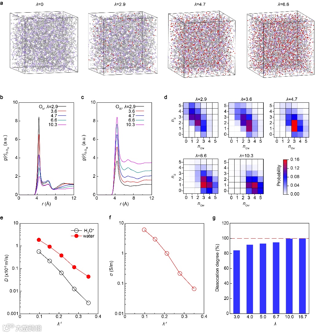 利用分子动力学模拟等方法,研究了该聚电解质材料与水分子相互作用的动力学过程。结果表明,聚电解质材料在不同水合程度下的离子电导率和离子扩散系数与水合程度紧密相关;水合程度越高,离子扩散越快,反之则越慢。