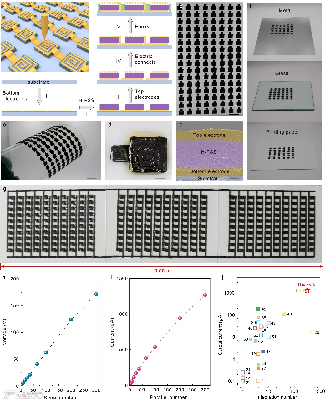基于3D打印技术,在不同基底上,如硬质玻璃和柔性PET等,实现了湿气发电器件的规模化制备与系统化集成。数百个3D打印的湿气发电器件最高可以输出超过180 V的电压和1 mA的电流。进一步证明该3D打印方法的规模化制备能力。
