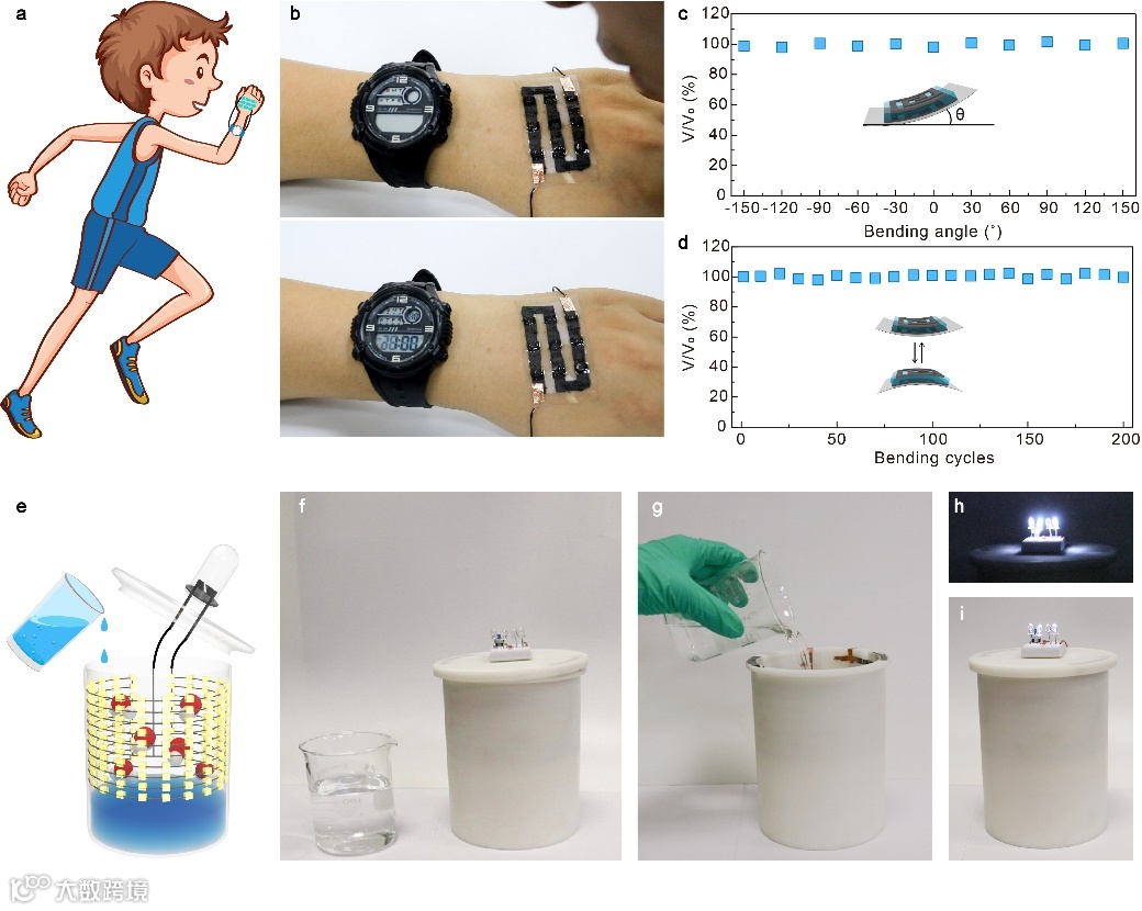 为展示该技术的实用性,作者设计了柔性湿气发电器件和“水灯”装置,利用人体呼吸和水自然蒸发产生的湿气,为电子产品等供电,展现了湿气发电技术广阔的应用潜力。