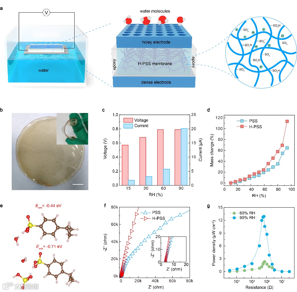 该工作采用酸掺杂的聚电解质薄膜作为湿气发电材料,通过构建非对称多孔电极对,利用环氧高分子作为选择性包覆层,在材料厚度方向上构建水合梯度。单个湿气发电器件能够自发地从周围环境中吸收湿气,产生0.8 V的输出电压和20 µA的输出电流,最高输出功率密度达到13 µW cm-2。