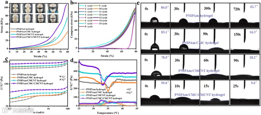 图2. (a)水凝胶的压缩应力-应变曲线(b) PNIPAm/CMC/CMCNT水凝胶在15个循环中的可逆压缩应力-应变曲线。(c-d)水凝胶的流变性能。(e)在室温下通过水凝胶顶部的水滴进行的动态润湿行为。