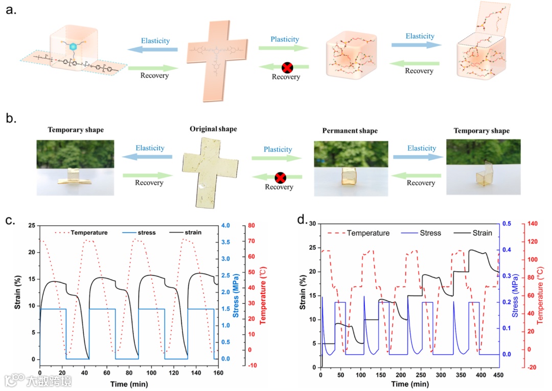 除可重加工性能外,动态HUBs还可以通过脲键之间的动态交换反应赋予合成EHTPUs三维(3D)永久形状重构能力,扩大了其潜在的应用前景。与传统的永久交联结构相比,动态HUB可以使EHTPUs在不同的温度区间经历永久和暂时的形状变化,两者甚至可在一个网络中实现弹性和塑性形状记忆的循环。宏观上EHTPU-2的弹性和塑性形状记忆过程如图4a-b所示,定量化的弹性和塑性形状记忆过程如图4c-d所示。