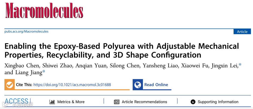 该工作以“Enabling the Epoxy-Based Polyurea with Adjustable Mechanical Properties, Recyclability, and 3D Shape Configuration”为题发表在《Macromolecules》(doi.org/10.1021/acs.macromol.3c01688)上。论文第一作者为四川大学硕士研究生陈兴宝,通讯作者为四川大学雷景新教授和江亮副研究员。本工作得到了中国博士后面上基金(2022M722238)、四川省青年科学基金(2023NSFSC0984)和高分子材料工程国家重点实验室(四川大学)“优秀青年人才”项目(sklpme2022-3-05)等项目的资助支持。
